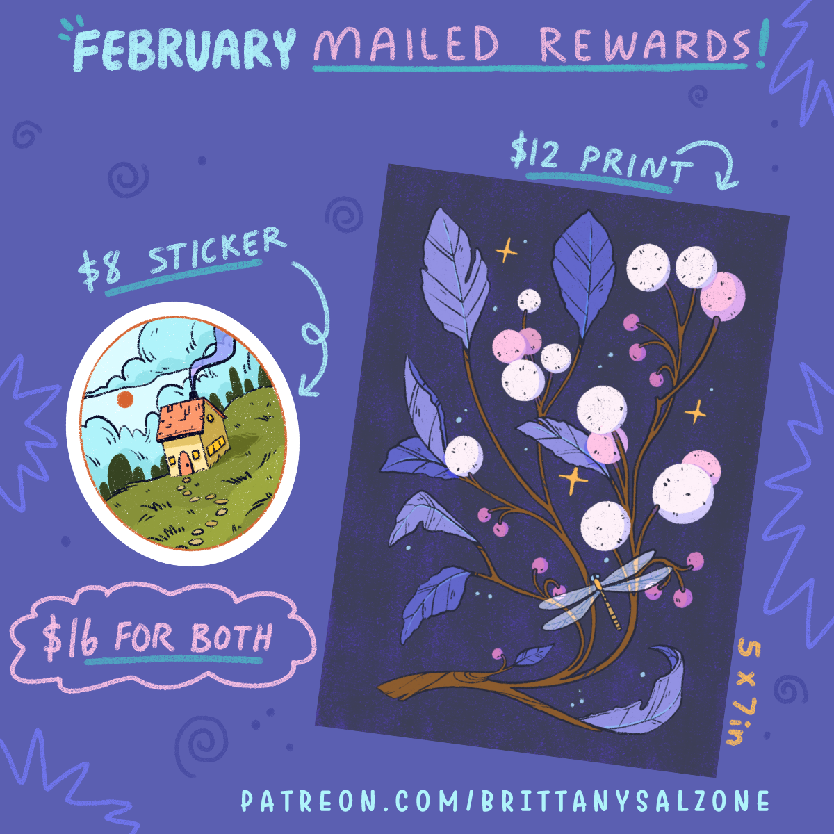 Depending on what tier you join, you'll get exclusive monthly goodies like digital downloads, prints, and stickers! I also offer 15% off in my shop if you join the $5 and up tiers! Thanks for looking! <3